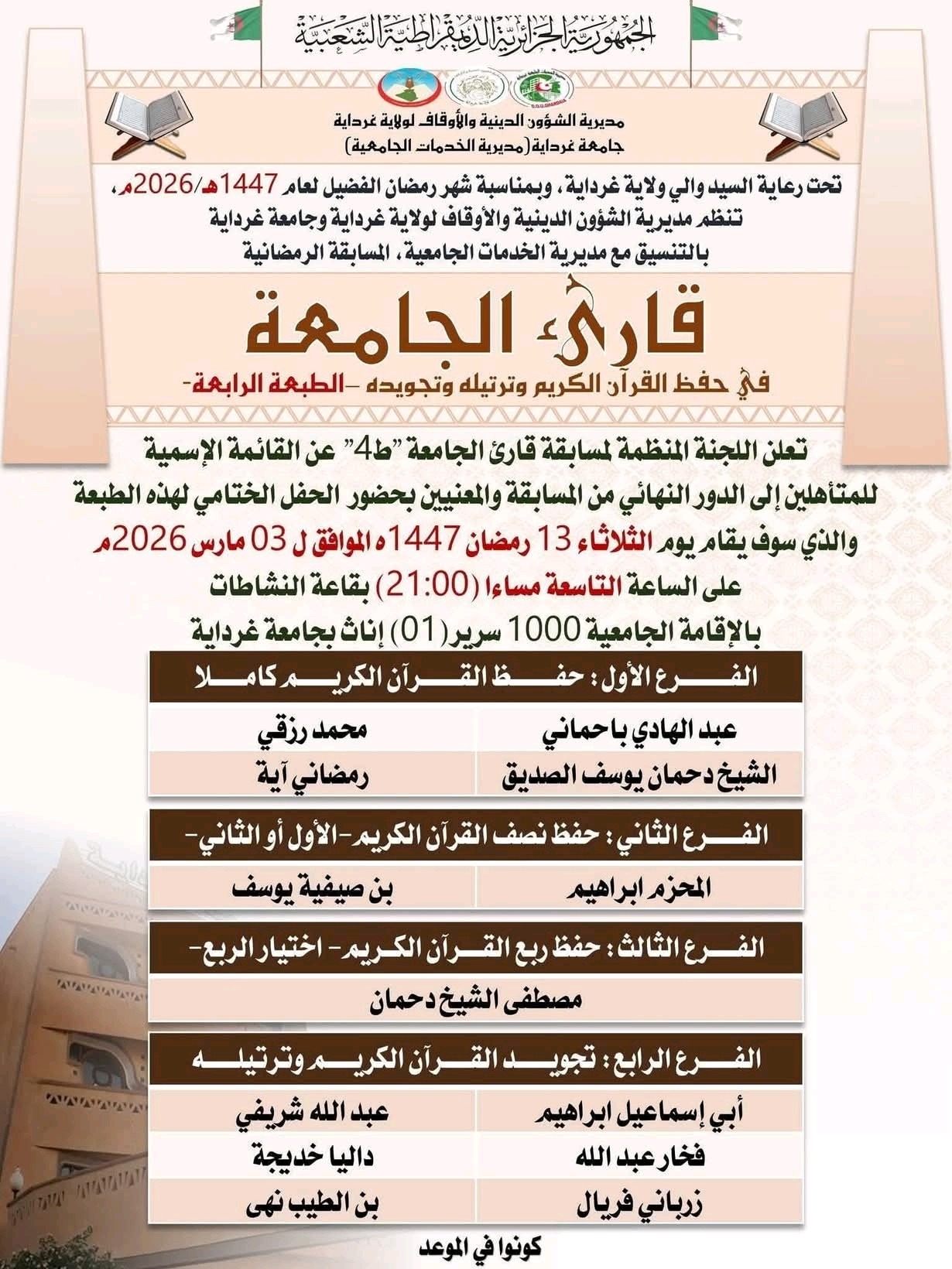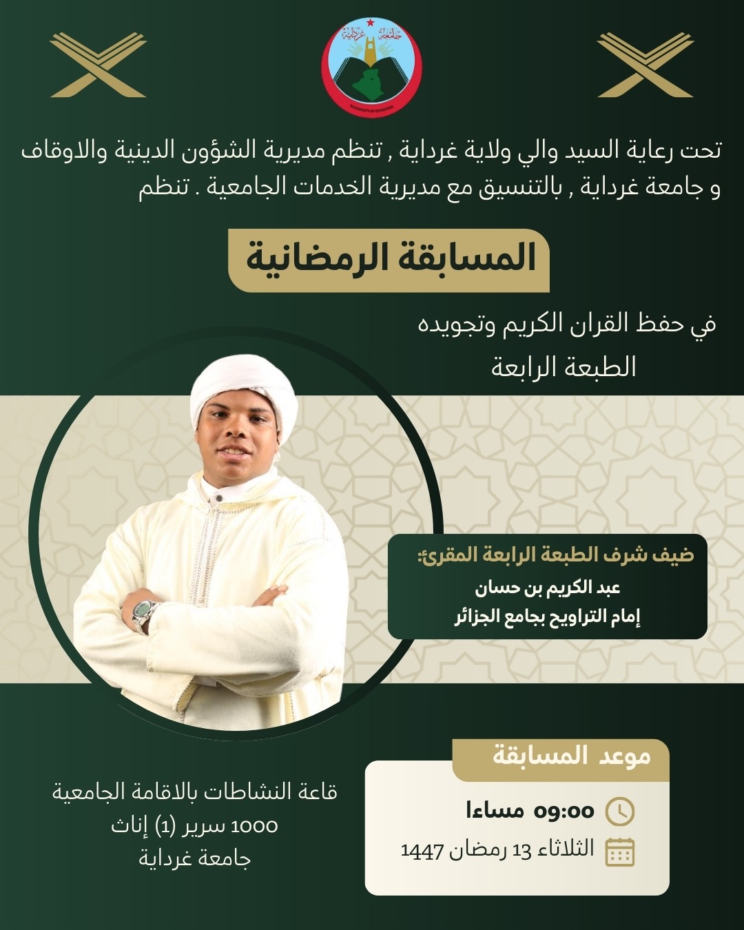 تحت الرعاية السيد والي ولاية غرداية و بمناسبة شهر رمضان الفضيل تنظم مديرية الشؤون الدينية لولاية غرداية و جامعة غرداية بالتنسيق مع مديرية الخدمات الجامعية مسابقة رمضانية